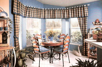 We chose to follow that horizontal direction with a straight topped treatment, to accent the bow by our choice of the mitered white rod, and then to play up the angled ceiling separately, by use of the bold blue wall color. In so doing, we've accomplished many things: bringing color, pattern and cheer into the space, adding softness, and visually defining the kitchen and eating areas.